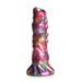 It's time to get bred by alien visitors. This thick, textured shaft from Creature Cocks is one of the most colorful yet with a mix of rich, vibrant, iridescent colors with shades of pink, green, orange and purple. The shaft itself is large and thick with tiny bumps on the head, ribbed texture along the opposite side, and a mixture of textures along the rod down to the wide, suction cup base. It can be used hands-free with the assistance of the suction cup or combined with a compatible harness for penetrating strap-on play or pegging! Insert any or all of the four larva eggs into the hollow sheath and then insert them into your hole, letting the ovipositor deposit those eggs to be birthed out of you later after you're full! Made out of flexible, super soft, premium silicone both the dildo and the eggs are phthalate-free, body-safe, and best used with water-based lubricants only. To clean after, use warm water and mild soap then spray with a toy cleaner before patting dry.