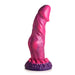 - Fantasy Dildo: This shiny, pink dong has purple accents, a smooth tapered head, a curved shaft, and a knot above the spiky base.