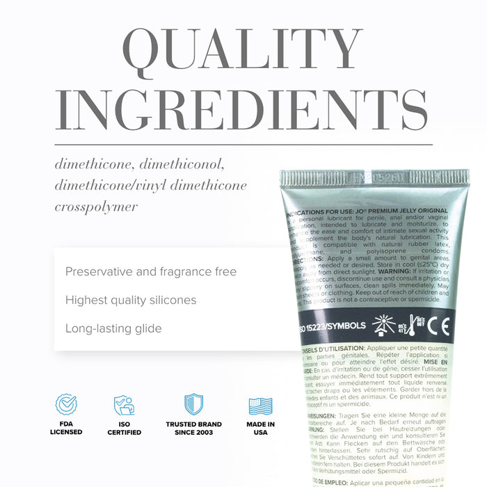 JO Premium Jelly Original is a luxurious, silicone-based formula that starts off thick and melts into a barely there long-lasting glide. JO Premium Jelly Original has that in.just rightin. consistency and cling, so itft.s perfect for extended sessions when you want to feel every movement. Its carefully balanced formula even dries to a sumptuous soft-touch finish that leaves your skin feeling soft and moisturized. This silicone-based formula means you can enjoy in.me timein. even longer.
