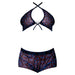 Expand your stoner lingerie selection with this playful set. Available in a choice of two color and print options: navy blue sheer mesh adorned with butterflies or black sheer mesh with all-over gummy bears; both prints are black light reactive under UV light. This black light lingerie set includes a halter top featuring front cutout details, and a matching flowy hot short that enhances your assets. Add this fun stoner-inspired set for an extra pop added to your collection.
